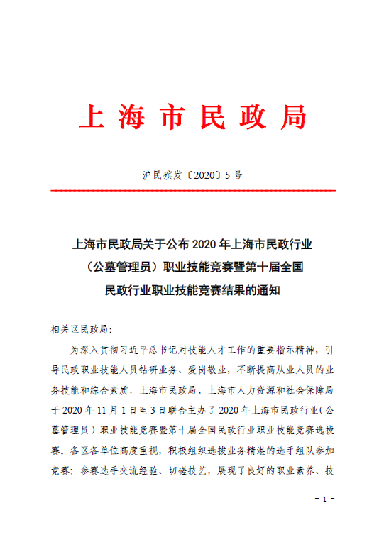 关于公布2020年上海市民政行业(公墓管理员)职业技能竞赛暨第十届全国民政行业职业技能竞赛结果的通知 ( 2020-11-20 )