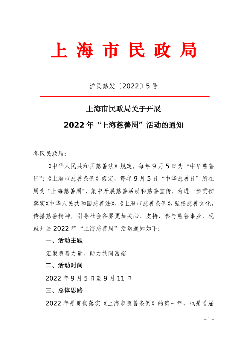 上海市民政局关于开展2022年“上海慈善周”活动的通知 ( 2022-08-16 )