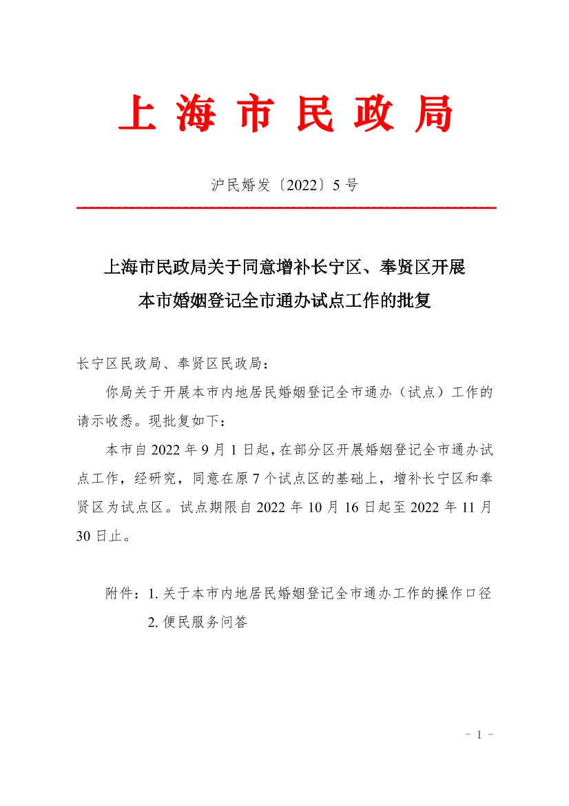 上海市民政局关于同意增补长宁区、奉贤区开展本市婚姻登记全市通办试点工作的批复 ( 2022-09-29 )