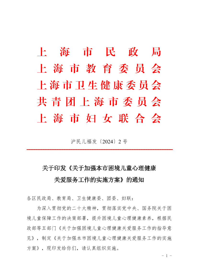 关于印发《关于加强本市困境儿童心理健康关爱服务工作的实施方案》的通知 ( 2024-03-15 )