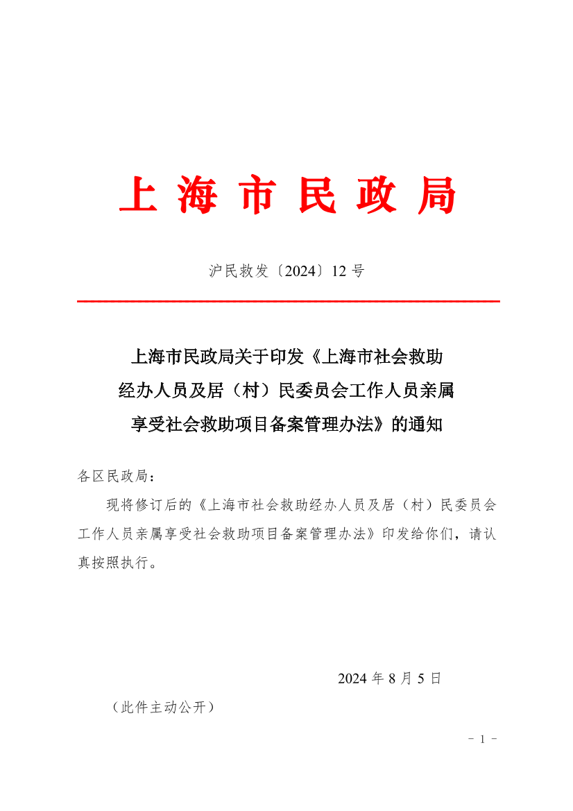 上海市民政局关于印发《上海市社会救助经办人员及居(村)民委员会工作人员亲属享受社会救助项目备案管理办法》的通知 ( 2024-08-13 )