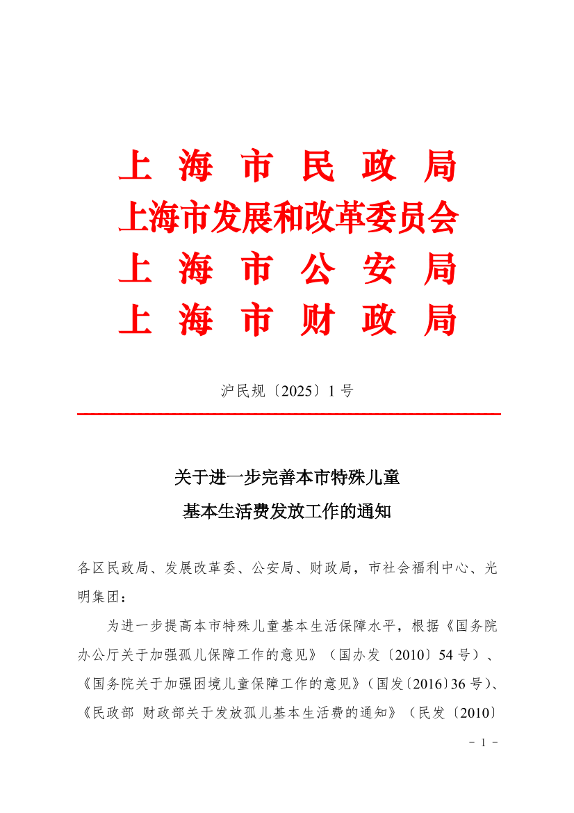 关于进一步完善本市特殊儿童基本生活费发放工作的通知 ( 2025-01-01 )