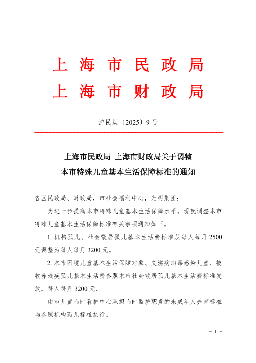 上海市民政局 上海市财政局关于调整本市特殊儿童基本生活保障标准的通知 ( 2025-04-09 )