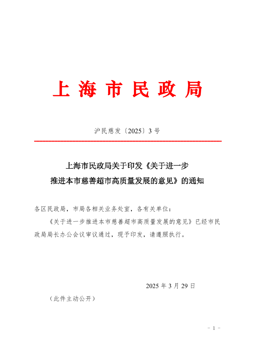 上海市民政局关于印发《关于进一步推进本市慈善超市高质量发展的意见》的通知 ( 2025-04-11 )