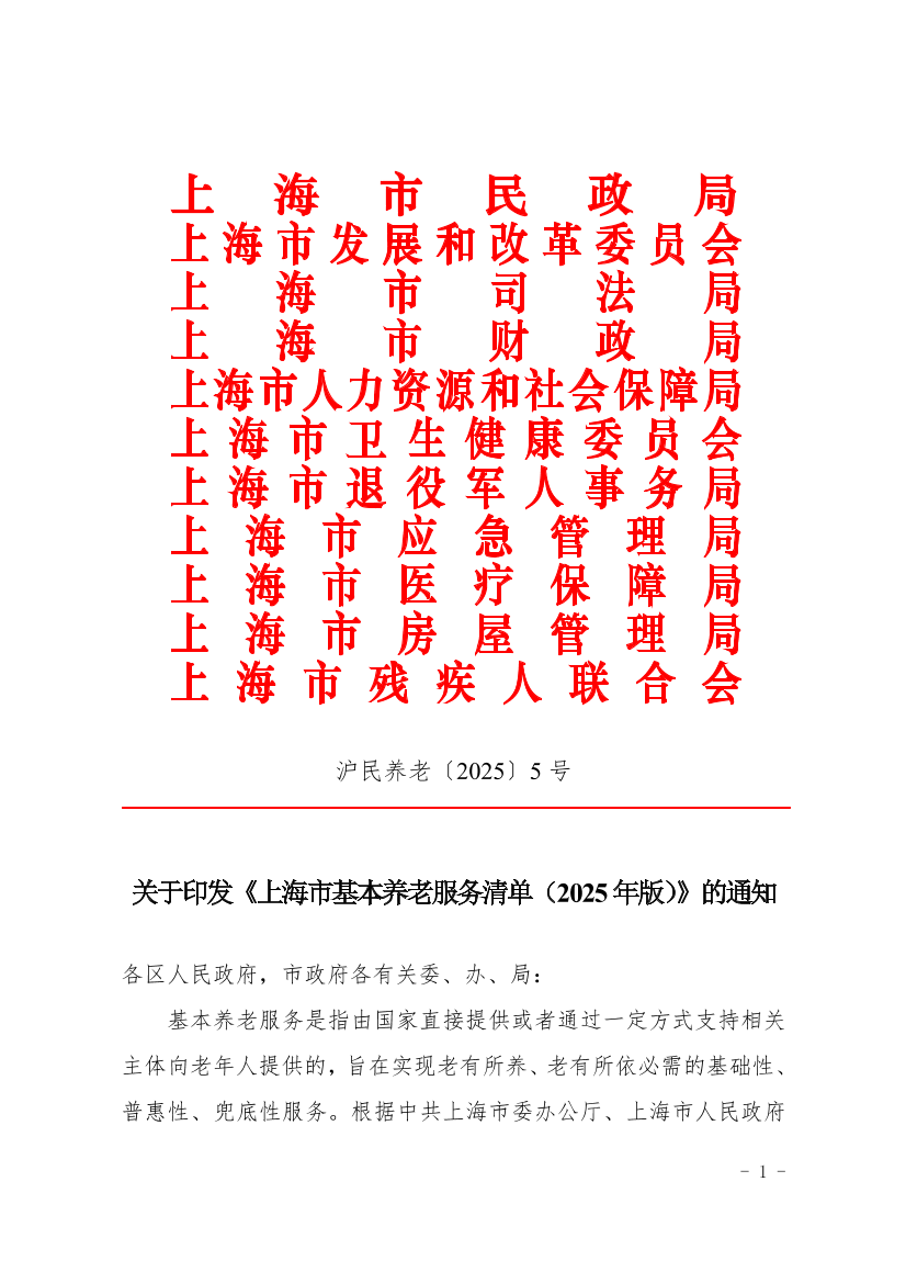 经报市政府同意,现将《上海市基本养老服务清单(2025年版)》印发给你们,请认真按照实施。各区、各部门要将保障基本养老服务作为改善民生的重点任务,细化配套措施,强化投入保障,不断提高基本养老服务的可及性和便利性,切实增进老年人福祉。