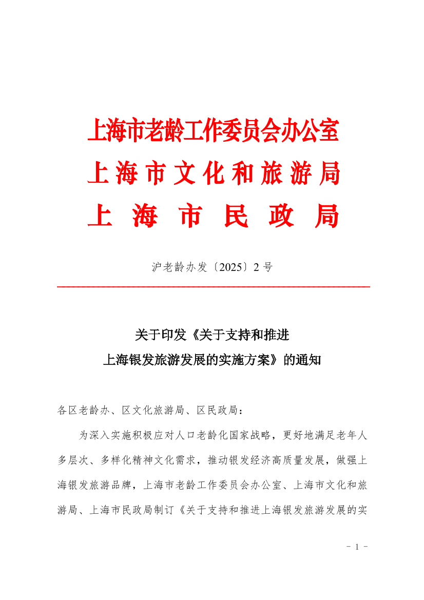 关于印发《关于支持和推进上海银发旅游发展的实施方案》的通知 ( 2025-04-16 )