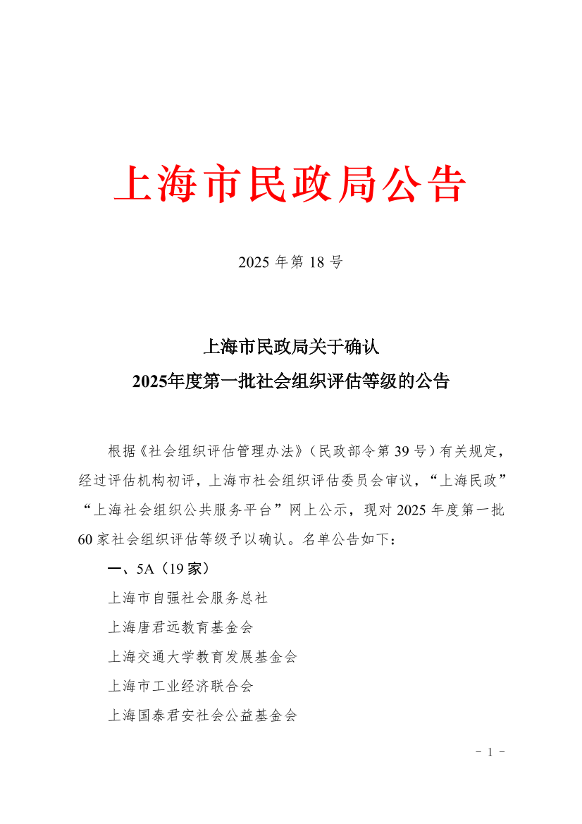 上海市民政局关于确认2025年度第一批社会组织评估等级的公告 ( 2025-04-28 )