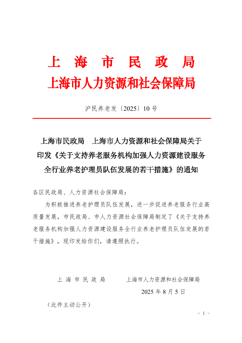 上海市民政局 上海市人力资源和社会保障局关于印发《关于支持养老服务机构加强人力资源建设服务全行业养老护理员队伍发展的若干措施》的通知 ( 2025-08-15 )