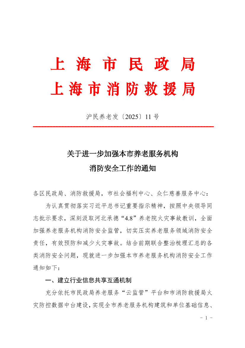 (一)根据《上海市养老机构品质提升三年行动方案(2025—2027年)》,积极推进养老服务机构全部实现消防安全标准化管理基础建设。