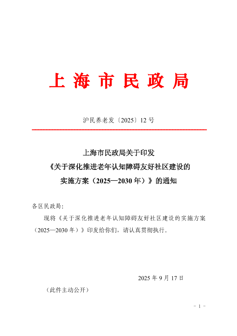 上海市民政局关于印发《关于深化推进老年认知障碍友好社区建设的实施方案(2025—2030年)》的通知 ( 2025-09-28 )