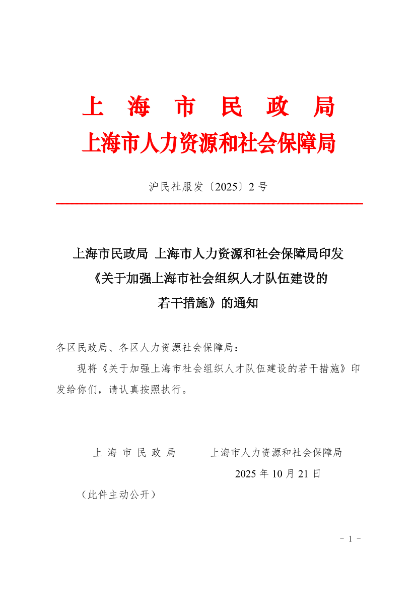 上海市民政局 上海市人力资源和社会保障局印发《关于加强上海市社会组织人才队伍建设的若干措施》的通知 ( 2025-10-30 )