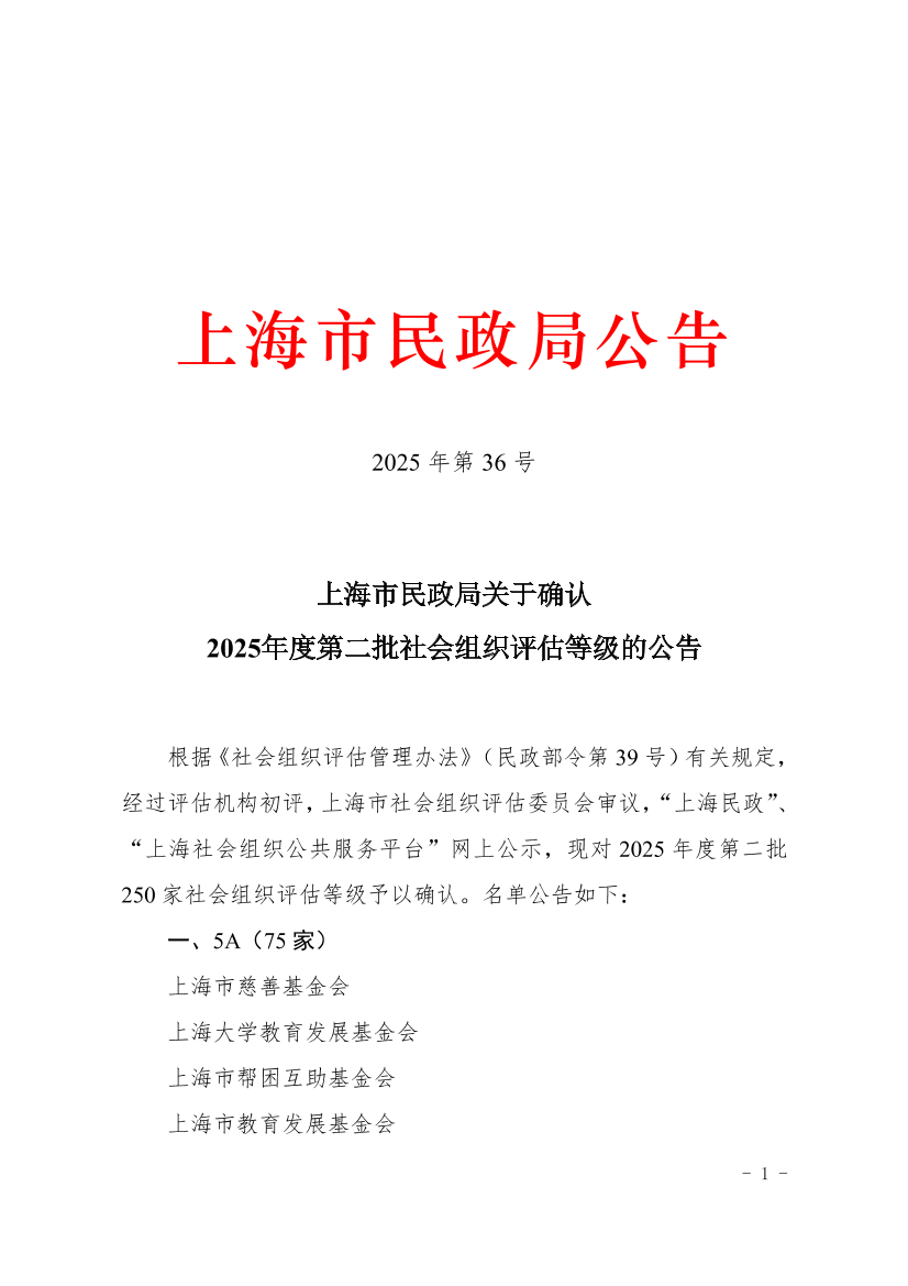 根据《社会组织评估管理办法》(民政部令第39号)有关规定,经过评估机构初评,上海市社会组织评估委员会审议,“上海民政”、“上海社会组织公共服务平台”网上公示,现对2025年度第二批250家社会组织评估等级予以确认。名单公告如下: