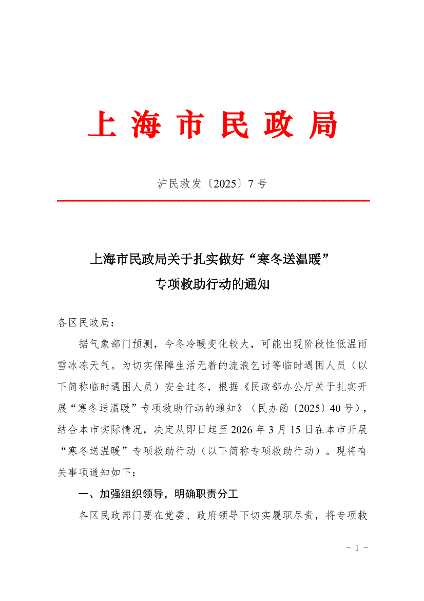 上海市民政局关于扎实做好“寒冬送温暖”专项救助行动的通知 ( 2025-12-03 )
