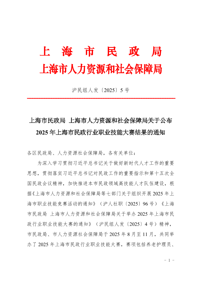 上海市民政局 上海市人力资源和社会保障局关于公布2025年上海市民政行业职业技能大赛结果的通知 ( 2025-12-18 )