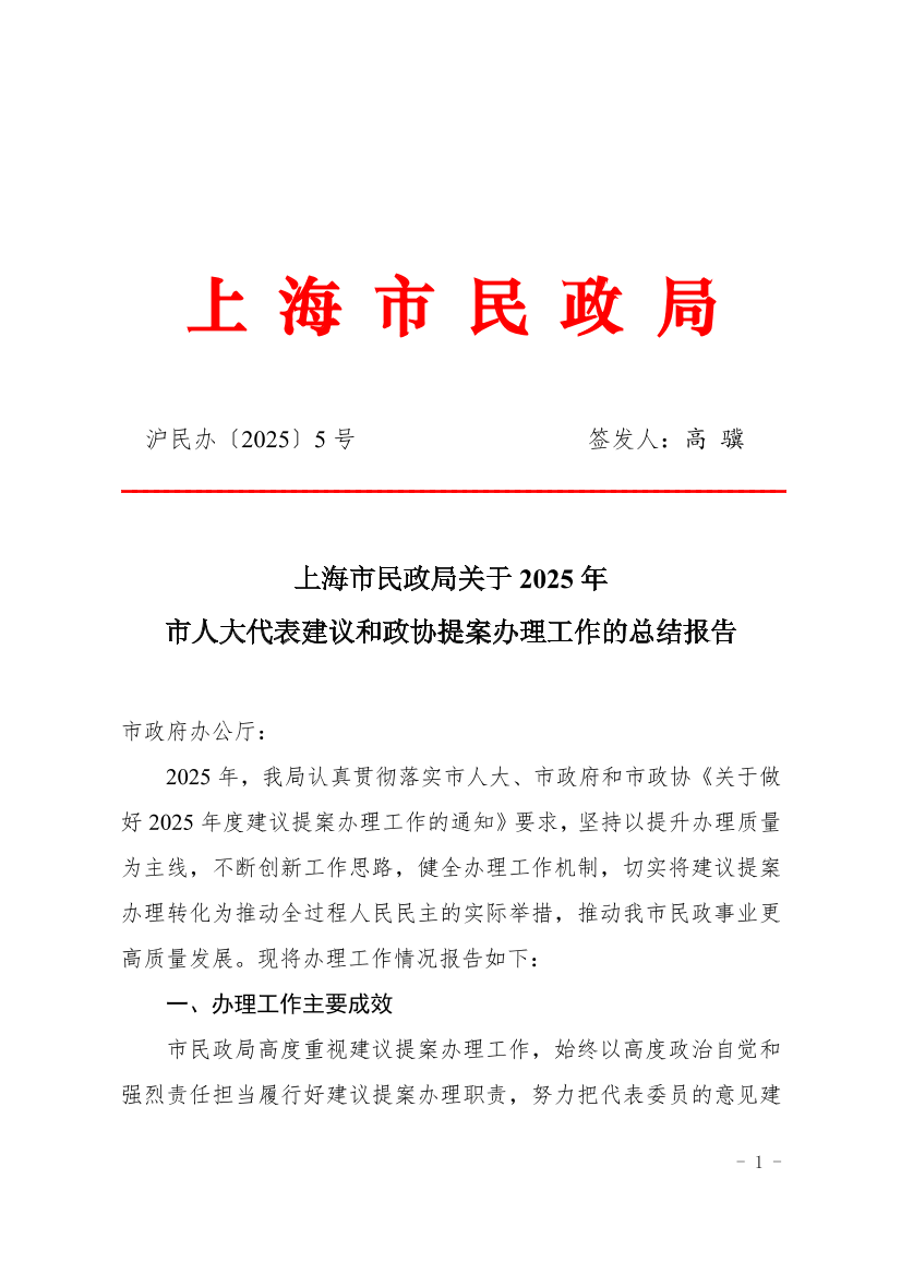 上海市民政局关于2025年市人大代表建议和政协提案办理工作的总结报告 ( 2025-12-24 )