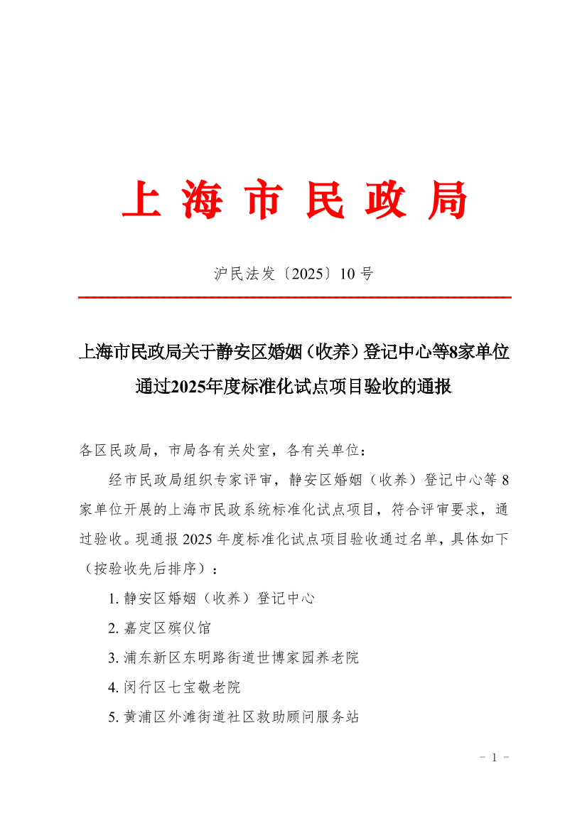 上海市民政局关于静安区婚姻(收养)登记中心等8家单位通过2025年度标准化试点项目验收的通报 ( 2025-12-31 )